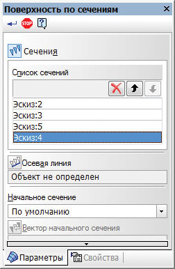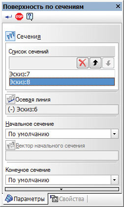 С помощью команды Поверхность по сечениям выполняется построение поверхности гарды. Для этого указываются эскизы сечений и осевая линия (рис. 14).