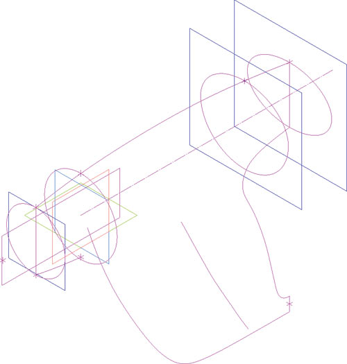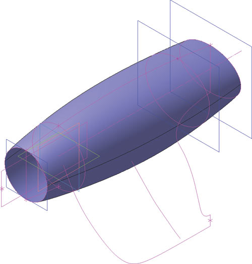Осевая линия уже присутствует в компоновочном эскизе. Эскизы сечений создаются на дополнительных плоскостях и содержат NURBSкривые, которым за счет параметрического выравнивания узлов и простановки размеров придается нужная форма (рис. 13).