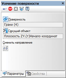 После создания заплаток на торцах и их сшивки будем продолжать построение только для половины получившейся поверхности. Для этого отрезаем часть поверхности профильной плоскостью с помощью команды Усечь поверхность (рис. 11).