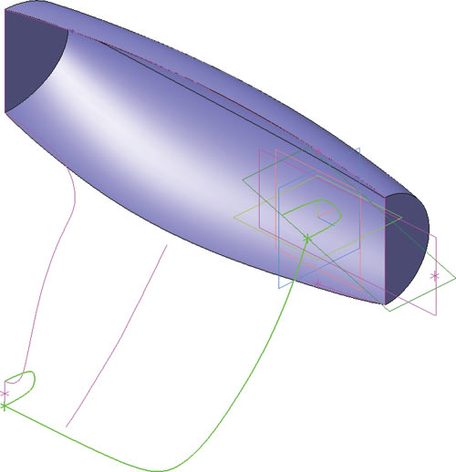 Для набора кривых продольного направления можно использовать две кривые из компоновочного эскиза. В качестве третьей кривой добавляется плавная пространственная кривая — сплайн, которая проходит через средние точки эскизов поперечных сечений (рис. 15).