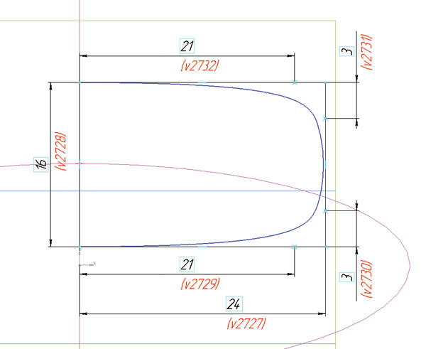 Конструктор формирует новый файл трехмерной детали. На системной плоскости он создает эскиз, в который частично передается геометрия, воспроизведенная дизайнером в 2Dфрагменте. Недостающие кривые нужно получить с растрового изображения, поэтому конструктор вставляет в эскиз рисунок, размещая его на отдельном слое. Используя рисунок в качестве подложки, конструктор просто обводит силуэт с помощью необходимых графических примитивов. В отличие от дизайнера, конструктор выполняет черчение в параметрическом режиме, что позволит в будущем при необходимости уточнять форму модели. После вычерчивания всех необходимых контуров, создания между элементами параметрических связей и простановки размеров получается компоновочный эскиз, который определяет форму модели и основные размеры ее элементов в продольном направлении (рис. 7).