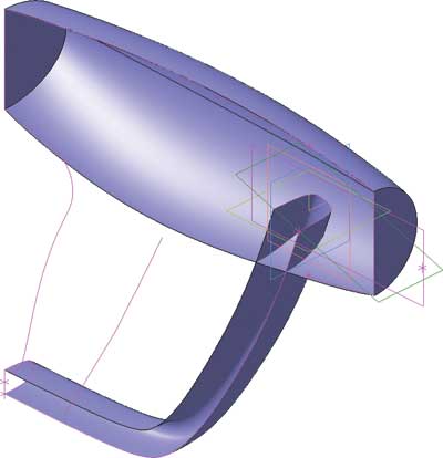 Плоскую заплатку на заднем торце корпуса дизайнер просит заменить на двояковыпуклую поверхность. Для этого создается кинематическая поверхность: дуга, нарисованная в профильной плоскости, перемещается вдоль направляющей — дуги, нарисованной в перпендикулярной к ней плоскости (рис. 19).