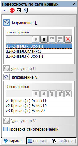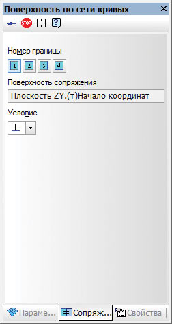 После подготовки сетки создается поверхность с помощью команды Поверхность по сети кривых. Для чего указываются наборы кривых по каждому направлению. Границам, лежащим в профильной плоскости, необходимо дополнительно наложить сопряжение «перпендикулярно», чтобы поверхность гладко сопрягалась с зеркально отраженной поверхностью будущей детали «крышка». Для этого на вкладке Сопряжения нужно указать номер соответствующей границы поверхности, объект сопряжения — плоскость, а затем определить условие — перпендикулярно. Наложенные сопряжения отображаются в модели рядом с номерами границ (рис. 16).