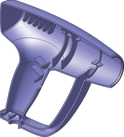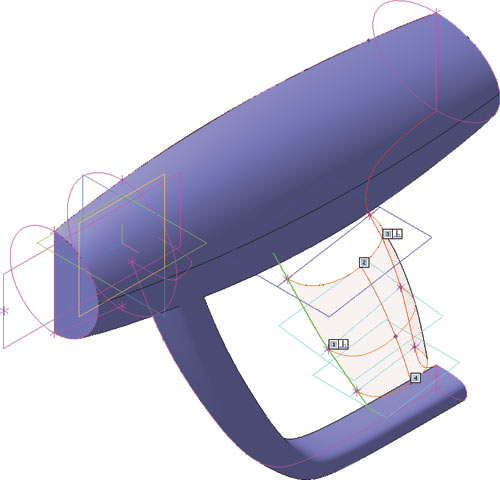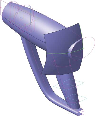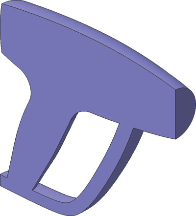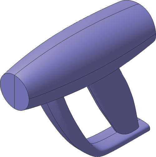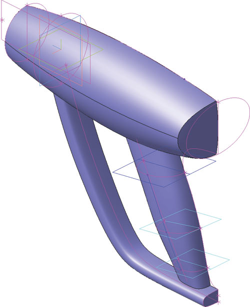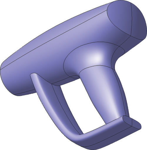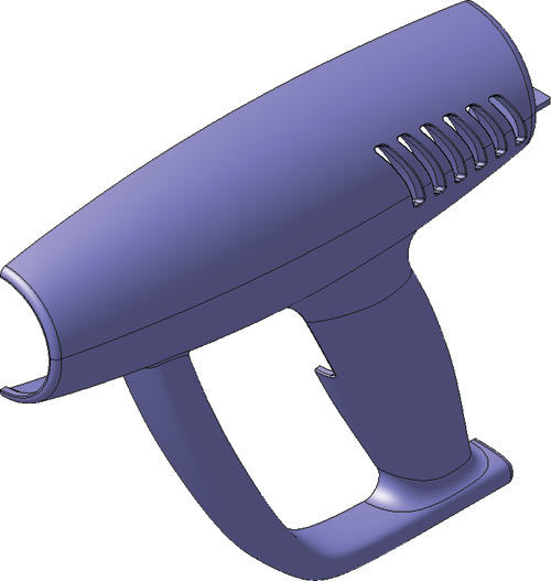 Рукоятка должна быть выполнена эргономично, чтобы термопистолет было удобно держать в руке. Для того чтобы гибко регулировать форму рукоятки, лучше всего применять поверхность по сети кривых. При этом достаточно использовать сеть, состоящую из трех кривых в каждом из двух направлений: поперечном и продольном.