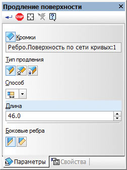 Поэтому первым делом мы осуществим продление поверхности рукоятки. После запуска команды Продление поверхности нужно указать кромку рукоятки, ближайшую к поверхности корпуса, задать тип продления (той же поверхностью), способ (На расстояние) и ввести числовое значение в поле Длина так, чтобы продленная поверхность рукоятки гарантированно пересекалась с поверхностью корпуса. Аналогично нужно продлить противоположную кромку рукоятки для гарантированного пересечения с поверхностью гарды (рис. 17).