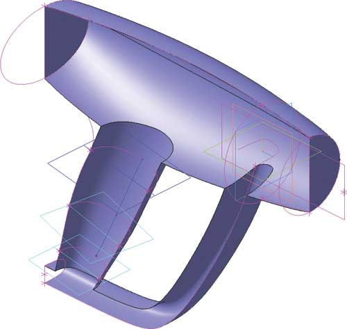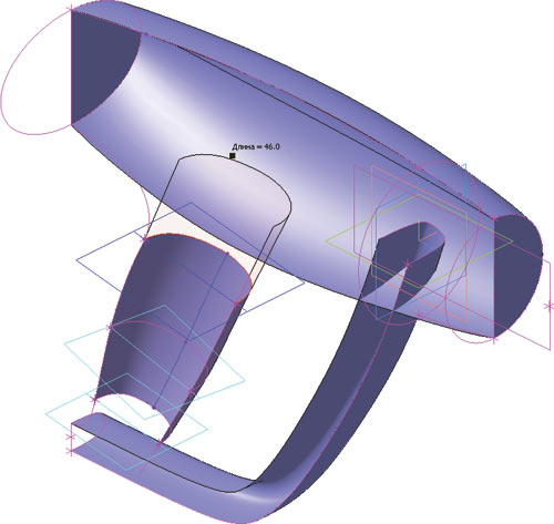 Для того чтобы правильно построить скругление рукоятки и корпуса, в модели временно создается правая половина: поверхности отражаются относительно фронтальной плоскости и сшиваются в единое целое.