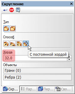 После этого можно скруглить ребра, по которым пересекаются корпус и рукоятка. Универсальная команда Скругление позволяет скруглять различными способами поверхности и тела. После ее запуска нужно указать скругляемые ребра, выбрать способ построения С постоянной хордой и задать величину хорды (рис. 22).