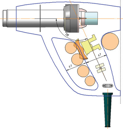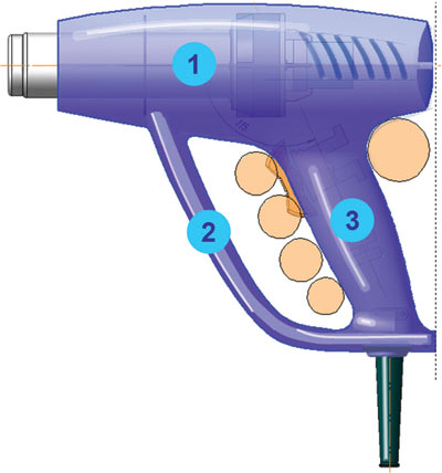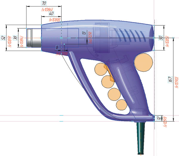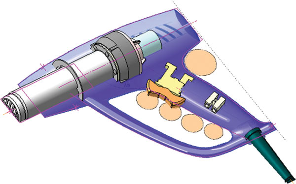 Какие средства для этого он использует? Конечно, КОМПАС. Дизайнер может работать и в 3Dсборке, и в 2Dфрагменте в зависимости от своего опыта и индивидуального ощущения эффективности. Заметим, что наш дизайнер решил работать в 2D, объясняя это тем, что при проработке множества вариантов взаимного расположения компонентов и силуэтной линии корпуса легче и быстрее перемещать плоские макроэлементы, чем пользоваться командами сдвигов и поворотов компонентов сборки и редактировать эскизные кривые. Элементами компоновочного эскиза у него являются растровые вставки, полученные со скриншота первоначальной сборки и обрезанные по контуру. Он может независимо перемещать те элементы, на которые не налагаются конструктивные ограничения. Например, разместив на компоновочном эскизе эргономическую схему, дизайнер может расположить выключатель и защитную трубку так, чтобы рукоятка соответствовала эргономике пистолетной рукоятки с определенным углом наклона ее оси по отношению к оси сопла (рис. 3).