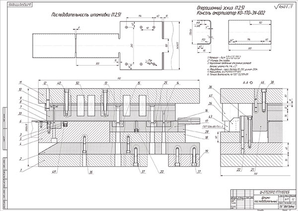 На первом примере приведены фрагменты курсовой работы по проектированию прессформ. Кажется, что сделать это просто, но не для начинающего. На втором примере приведен вырубной штамп, сделанный в рамках дипломного проекта. Вроде бы не так уж и страшно, но попробуйте довести это до рабочих чертежей и реализовать в металле.