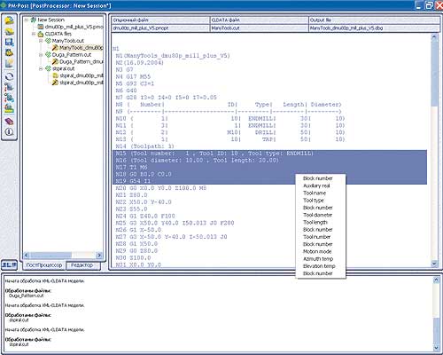 Постпроцессор позволяет генерировать управляющую программу в двух режимах: в обычном и в режиме отладки. Режим отладки предназначен для проверки или корректировки опционных файлов. В этом режиме пользователь путем быстрого перехода в редактор опционных файлов может корректировать такие моменты, как неправильный вывод для команд или неверный формат для каких-либо параметров вывода в генерируемой управляющей программе. Если в режиме отладки пользователь обнаружил в сгенерированной управляющей программе неверный вывод, то он может с помощью всплывающего меню постпроцессора или просто двойным щелчком мыши перейти в настройки соответствующей команды или параметра для его редактирования. После этого можно вернуться в постпроцессор, заново сгенерировать управляющую программу в режиме отладки и сравнить старый вывод с новым. Все это позволяет наглядно оценить проведенные им изменения.