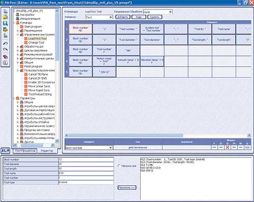 Принцип создания файла конфигурации заключается в том, что управляющая программа разделяется на ряд блоков, каждый из которых отвечает за определенную функцию программы: за начало программы, за смену инструмента, за линейные, круговые, ускоренные перемещения и т.д. Каждому блоку программы в PM-Post соответствует команда, описывающая структуру кадров данного блока в виде таблицы: строка таблицы это выводимый кадр программы, а элемент строки выводимый в кадре параметр. Пользователь может контролировать правильность конфигурирования любого блока с помощью предварительного просмотра представления данного блока в виде NC-команд. Взаимосвязанные переходы между блоками, параметрами и форматами их вывода позволяют быстро получить необходимую конфигурацию параллельно с проверкой. Интерфейс программы предоставляет инструментарий для связывания параметров настройки между собой, что дает возможность назначения некоторых условий вывода данных в УП в зависимости от входных данных. В интерфейс встроена система сообщений пользователю о внесенных изменениях и возникающих ошибках. Операции отмены действий позволяют пользователю переходить на любую стадию разработки.
