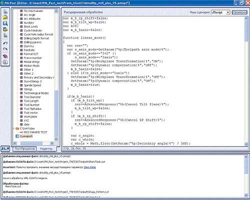 Для конфигурирования систем контроллеров со сложной кинематикой и для решения некоторых специфических задач PM-Post снабжен весьма мощным инструментом модулем расширенной обработки, который базируется на использовании технологии программирования Microsoft Active Scripting и стандартных языков программирования JScript и VBScript.