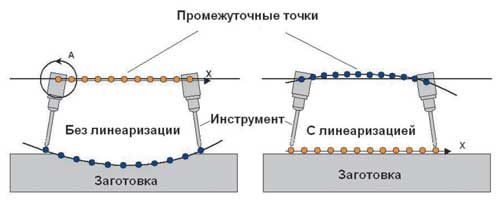При работе с многоосевыми траекториями PM-Post поддерживает как «чистую» многоосевую обработку, так и обработку типа «3+2», то есть переход в заданную локальную систему координат и генерацию в ней 3-осевой программы. Также поддерживается линеаризация многоосевых перемещений с заданной точностью. Во всех случаях вывод координат может быть настроен пользователем по своему усмотрению. Так, для команды перемещения можно задать машинные координаты или применить RTCP-вывод (Rotate Tool Center Point), когда контроллер компенсирует геометрию станка. Могут быть также указаны углы поворота вокруг поворотных осей станка или вектор направления инструмента в пространстве.