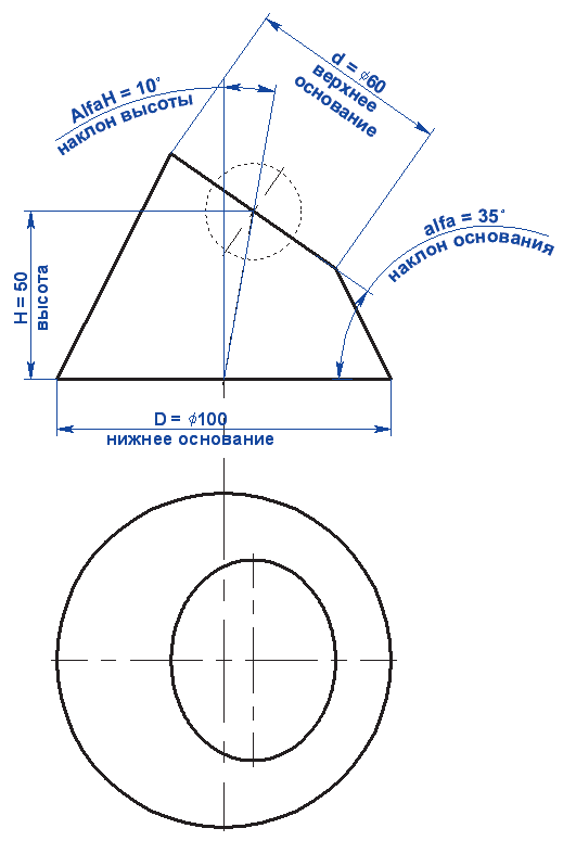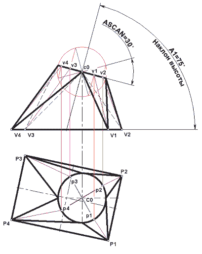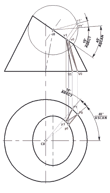 На виде спереди дополнительно строится проекция верхнего основания и проводятся из центра с0 два луча, один из которых откладывается под углом, задаваемым переменной ASCAN к линии, определяющей плоскость верхнего основания, а второй под углом к первому лучу, задаваемым переменной ASECT . Таким же образом на виде в плане проводятся два луча из центра С0 , первый из которых откладывается под углом к оси абсцисс, задаваемым переменной ASCAN , а второй под углом к первому лучу, задаваемым переменной ASECT .