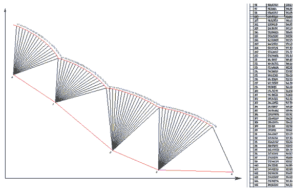 Затем, аналогично предыдущему примеру, также используется анимация модели с заданным параметрами с сохранением результатов вычислений длин отрезков при каждом шаге в базе данных. Переменным параметром при анимации является угол ASCAN , который меняется в пределах от 0 до 90°. Число шагов определяется углом сектора ASECT , чем обеспечивается требуемая точность построения будущей развертки. В приведенном примере задавалась величина ASECT = 5°.