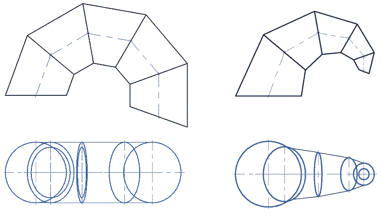 Уменьшая размер сектора, мы можем достичь повышения точности при этом трудоемкость несколько увеличивается за счет увеличения числа фрагментов. Остается добавить, что трансформация полученных таким образом моделей для получения разверток любого типа или при изменении размеров элемента достигается только путем изменения параметров исходного элемента.