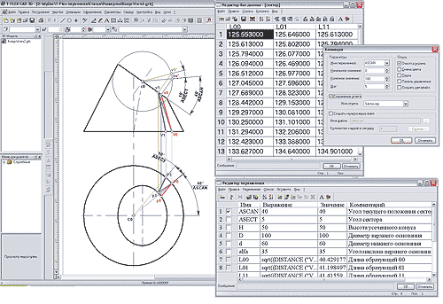С помощью имеющихся средств T-FLEX CAD в специальном редакторе переменных замеряются длины полученных проекций, по которым вычисляются длины построенных образующих и диагоналей сектора.
