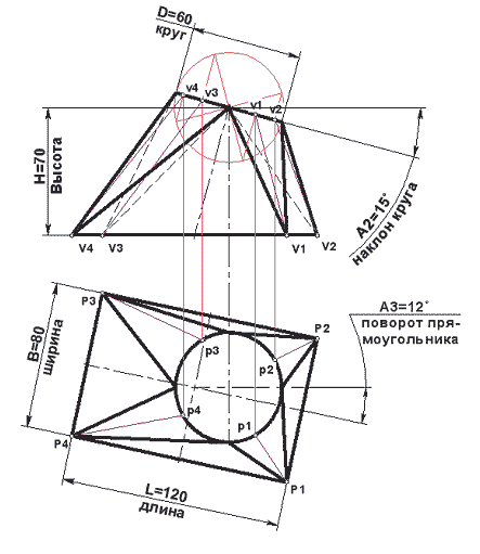 Точки пересечения лучей с окружностью верхнего основания проектируются на проекцию верхнего оснований на виде спереди, давая, таким образом, соответственно точки v1, v2, v3 и v4, а на виде в плане точки V1, V 2, V 3 и V 4 . Соединяя полученные таким образом точки с соответствующими вершинами прямоугольников на проекциях нижнего основания, получаем проекции образующих конических участков перехода из прямоугольника в окружность.