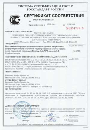 Согласно сертификату соответствия № РОСС US.ME20.Н01147 от 12.08.2005, в настоящее время программа AutoPIPE отвечает требованиям следующих нормативных документов: