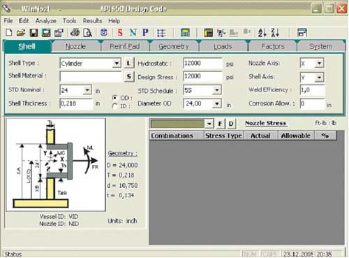 Программа AutoPIPE автоматически импортирует нагрузки в модуль WinNozl. Пользователю остается только задать геометрическое расположение резервуара и патрубка и выбрать метод расчета.