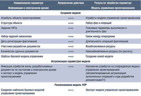 Благодаря наличию структурированной информации в электронном архиве и возможности ее экспорта в программу управления проектами, например в Spider Project, Primavera и пр., оптимальным представляется использование электронного архива как инструмента по формированию моделей управления проектированием с учетом практической регистрации сроков и связей по передаче информации при разработке конкретных проектов.
