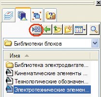 1. В среде Чертеж, используя закладку Библиотека навигатора, укажите файл чертежа Solid Edge, который является библиотекой блоков или просто содержит нужный блок. В данном случае пусть это будет Электротехнические элементы (рис. 12). Нажмите кнопку Показать блоки, если она не нажата.