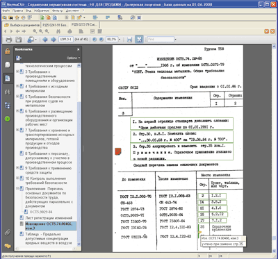 - закладки прямого доступа к структурным элементам нормативного документа, извещениям об изменениях;