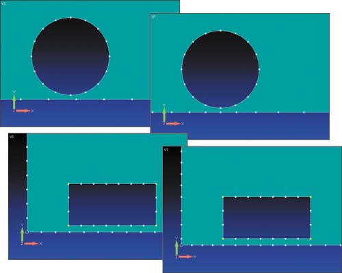 - отстоящие кривые — построение отстоящих (смещенных) кривых позволяет контролировать качество КЭ-сетки в зонах концентраторов напряжений, например отверстий или скруглений.
