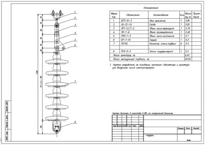 - спецификация оборудования, ведомость гирлянд и изоляторов, ведомость гасителей вибрации, расчет и проверка тоннажного ряда изоляторов;